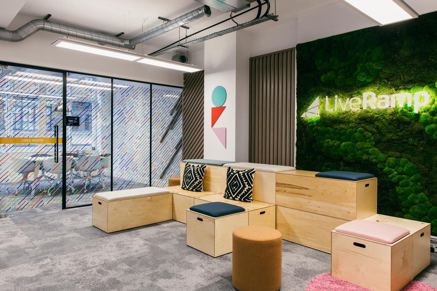 LiveRamp’s London space showcased their unique mission statement and values. Custom graphics throughout the suite displayed key phrases across large communal walls, meeting rooms, phone booths and directional signage. The visual system coordinated directly with vibrant color furniture selections, which enhanced the functional qualities of the office.