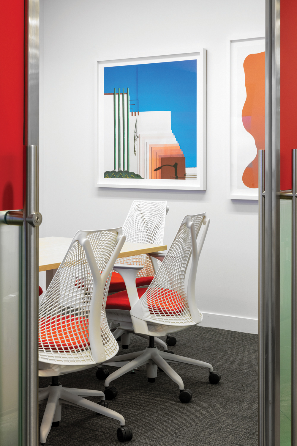 Oracle’s NYC space centered around bright and vibrant colors. The new employees requested a fun environment that reflected the youth and diversity of their teams. All wall surfaces, glazing, furniture and acoustic treatments received a unique color palette. In the recreational space, NYC based artist Jason Naylor created custom murals. In the conference rooms, UpRise Art developed artwork packages that coordinated with the branding and interior finishes. The immersive color plan and custom artwork selections created a visual foundation for the new culture at Oracle NYC.